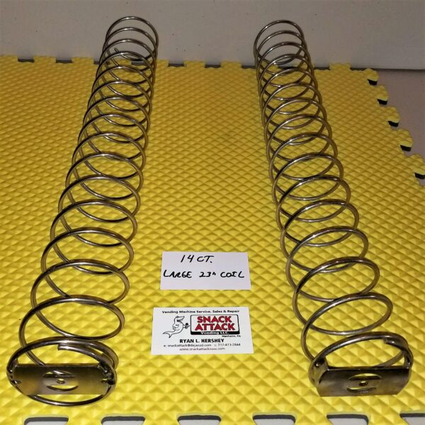 (2) AP 4600, 6600, 7600, 112, 113, LCM 2, 3, 4 Snack Vending Machine - CHIP Bag "15" Product Count LARGE Spirals / Coils. The total length of spiral measures 23" & Diameter is 3". The depth between spirals is 1.5". The Coils either have metal or white spiral hub retainer included. These Spirals install in seconds. The spirals are lightly used.