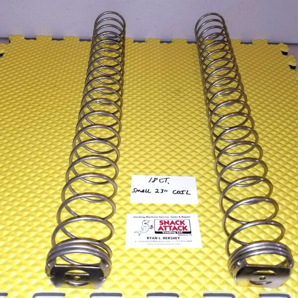 (2) AP 4600, 6600, 7600, 112, 113, LCM 2, 3, 4 Snack Vending Machine - CANDY BAR "18" Product Count SMALL Spirals / Coils. The total length of spiral measures 23" & Diameter is 2". The depth between spirals is 1 1/8". The coils will have metal or white spiral hub retainer included. These Spirals install in seconds. The spirals are lightly used.